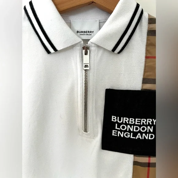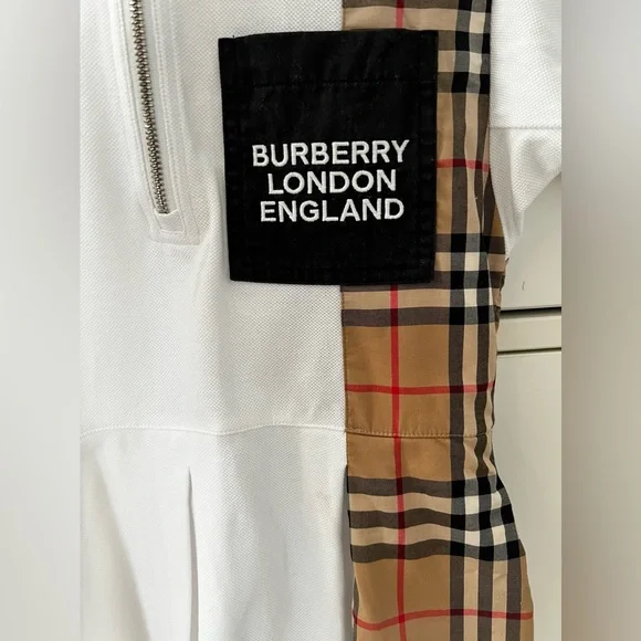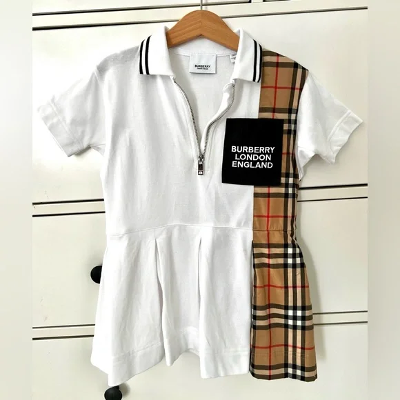 FEATURESFits true to sizeTipped polo collarShort sleevesQuarter zip placketChest patch pocket with graphic logoPleated skirtVintage check panelImportedMATERIALS & CARESelf: 100% cotton; panel: 95% cotton/5% elastane; trim: 90% cotton/9% polyester/1% elastaneMachine wash Dress is in good used condition. Worn once. It’s a white kids dress so please be aware it has in my opinion minor untreated stains.
