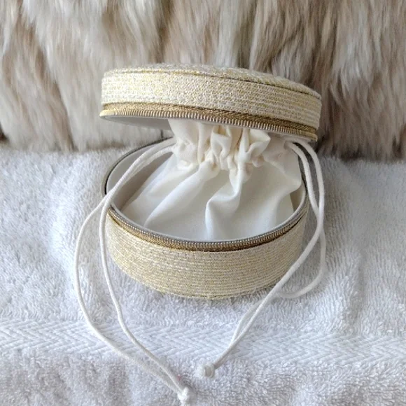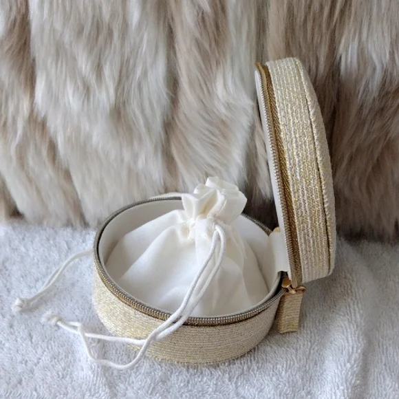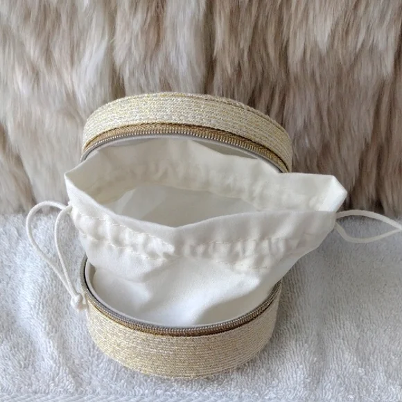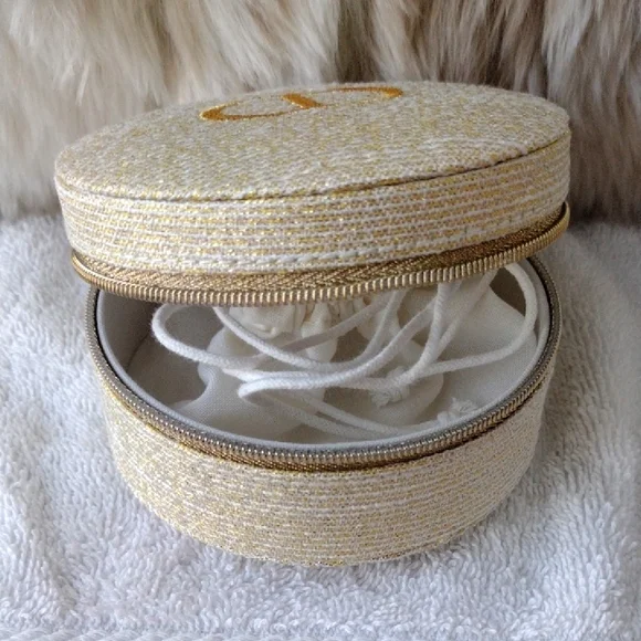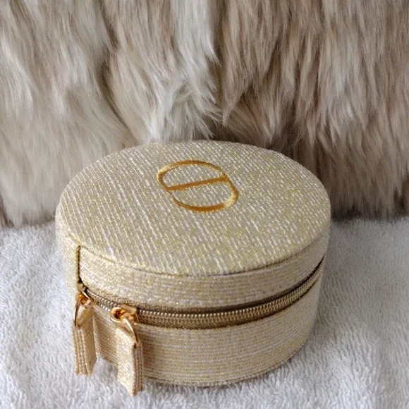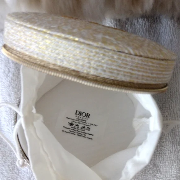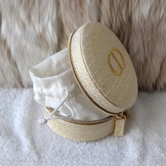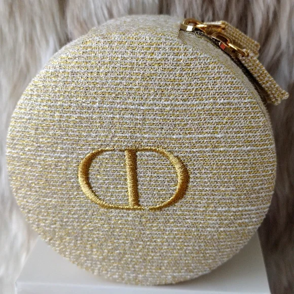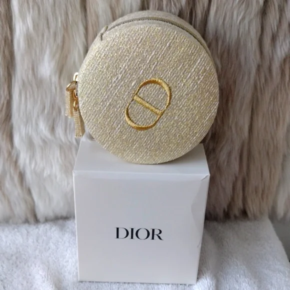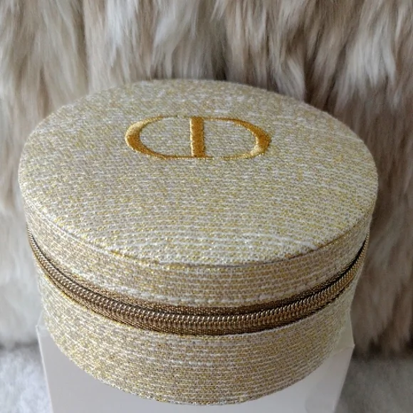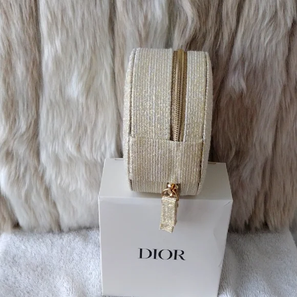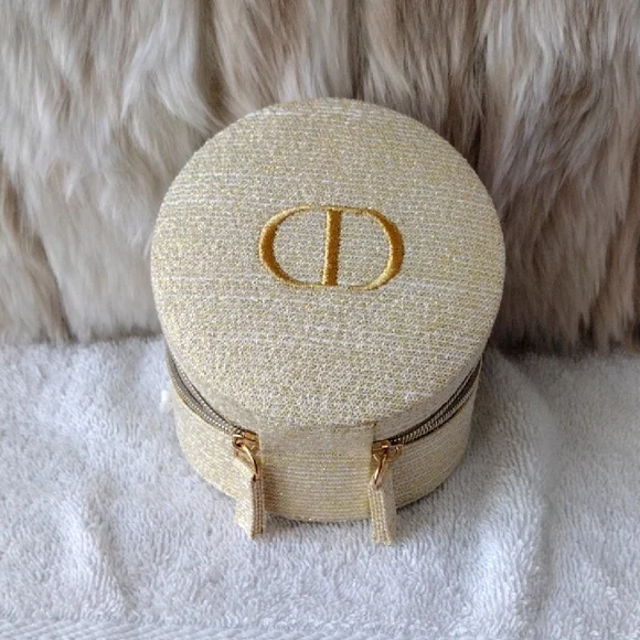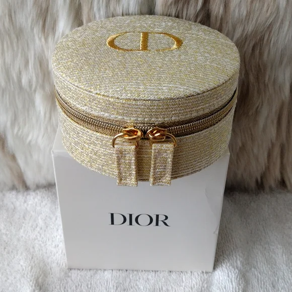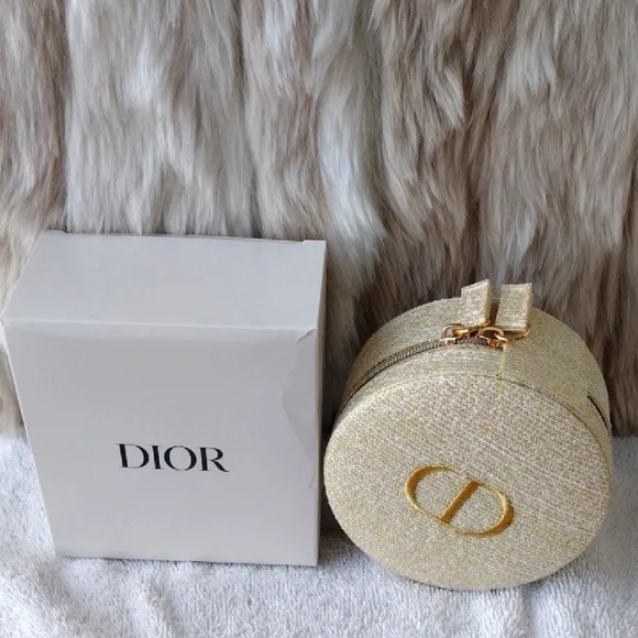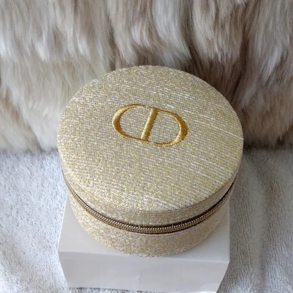 New, never used.Super pretty Dior shimmering gold case. CD logo on the top. Zips to open and close.Inside drawstring pouch.Perfect for carrying essentials, jewelry, etc.Comes with the box but see pics.Approximately 4x4. From the Dior beauty collection.Smoke and pet free home. Please see my closet for more items. Thank you!