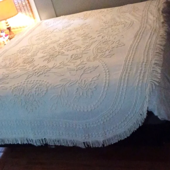 Elevate your vintage bedding collection with this stunning Needlecraft Original chenille bedspread, expertly crafted in the USA. Sized for a twin bed, this white tufted chenille coverlet features an elegant floral medallion design with intricate texture and classic fringe edging. This piece is in immaculate condition – no stains, no spots, no flaws – and offers a perfect blend of nostalgic charm and cottagecore aesthetic.Ideal for a shabby chic, farmhousevintage-inspired bedroom, this collectible piece brings cozy elegance and timeless craftsmanship into any home. Add this mid-century American-made textile to your décor or collection with confidence.vintageBeautiful white bedspread with intricate textured floral patterns. Perfect for adding elegance to any bedroom.