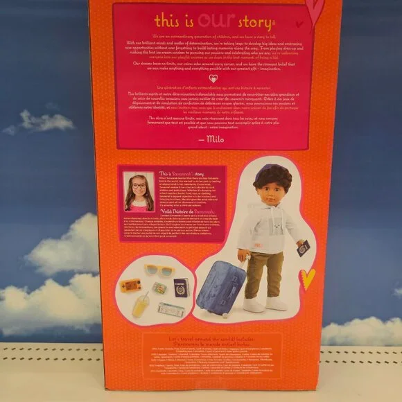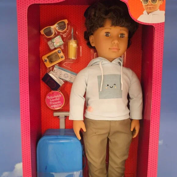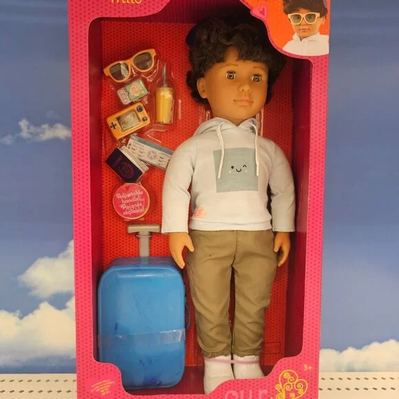18-inch Boy Doll: Meet Milo! This Our Generation 18-inch boy doll lets little travelers explore miles of adventures in cool style.Detailed Features: Milo has lifelike hazel eyes that open and close with curly, dark-brown hair that's fun to style.Easy to Play: He has a huggable soft body with a movable head, arms, and legs for kids to easily change his outfit during dress-up.Includes: 18-inch boy doll, a beanie hat, a graphic hooded top, cargo-style pants, a pair of undies, running shoes, a rolling luggage with an adjustable handle, trendy sunglasses, a passport, a boarding pass, a smoothie, a pack of gum, and a pretend video game console.The item pictured is brand new and unopened/unused.Packaging shows some wear and tear.Please carefully review all of the pictures as they are part of the description.The price includes the item shown in the pictures.Create your very own custom bundle and get a special discounted price! Please browse through my collection and select multiple items to create a bundle tailored to your needs. Don't miss out on this opportunity to save big on your purchase!